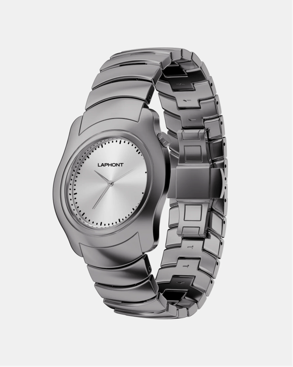 ケースと連続するように設計されたカスタムメタルブレスレットは、静と動のバランスを象徴し、LAPHONTが追求する“構築美としての時計”という哲学を体現しています。