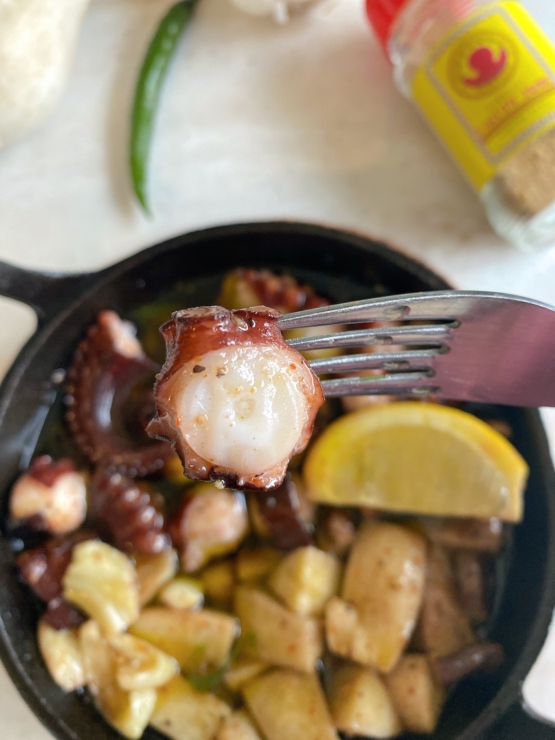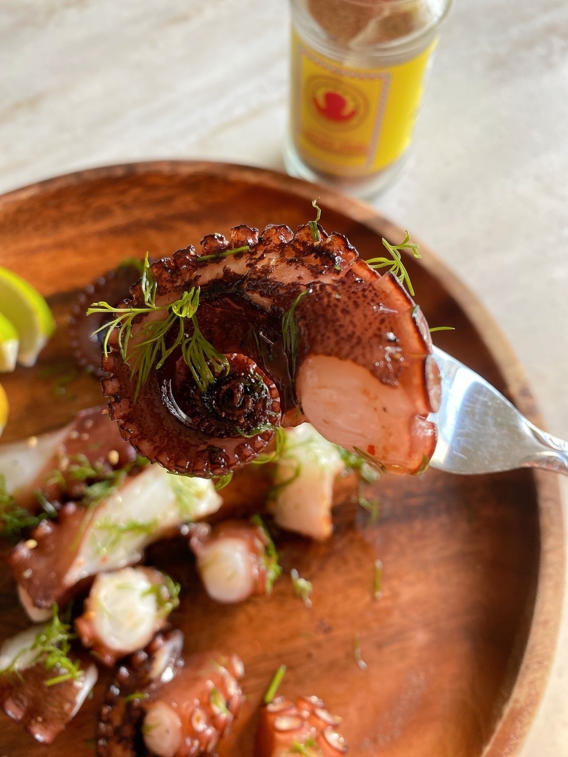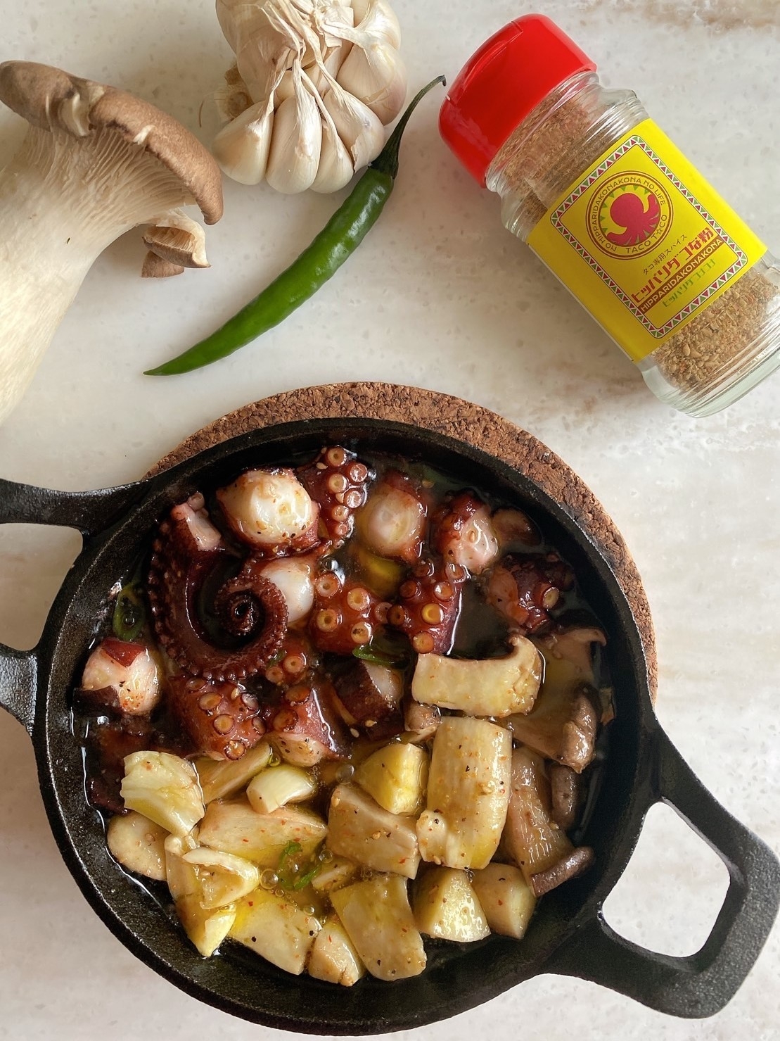 柑橘系のスパイスを使用し、タコの旨味を引き出すためにニンニク、玉ねぎなどを加え味、香り、を徹底的に追求し、黄金比率で配合しました。