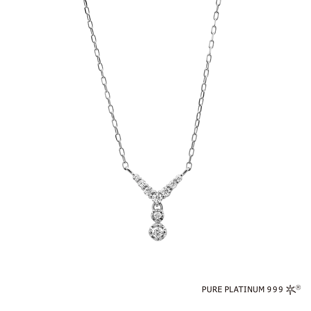 V字のすっきりとしたシルエットが際立つ、プラチナ素材のシンプルなネックレス。動きに合わせてダイヤモンドが揺れ、上品な輝きを放ちます。V字の部分はフォルムが綺麗に出るようにダイヤモンドを敷き詰め、また下の揺れる部分はダイヤモンドの輝きが引き立つように留めるなど、細部までこだわったデザインです。シャツなどVネックのトップスに合わせるとより美しく見えるシルエットで、ビジネスシーンなどきちんとした場面にもぴったり。大人にふさわしい知的さと華やぎを与えてくれます。