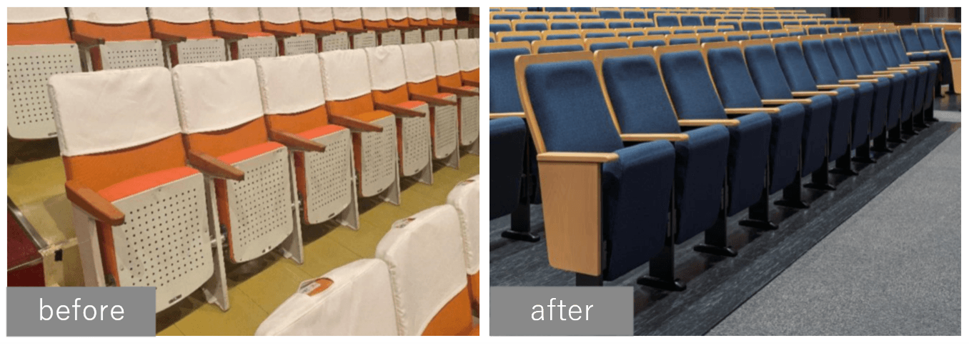 リニューアル前後の、イスの写真と図面を掲載することで、見栄えの変化と寸法の改善点を比較しました。「座り心地の向上」「バリアフリーへの配慮」「施設ブランディング」に関するアイデアや、客席リニューアルの効果をわかりやすくご紹介しています。