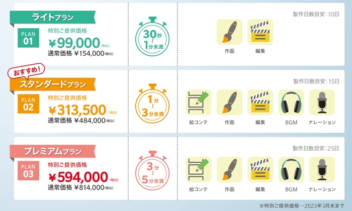 サービスは、動画の長さに応じてライト、スタンダード、プレミアムの3プランを用意しており、企業PR、販促、採用などのプロモーションから社内向けの教育・マニュアル動画まで、用途に応じて最適なプランを選ぶことができます。