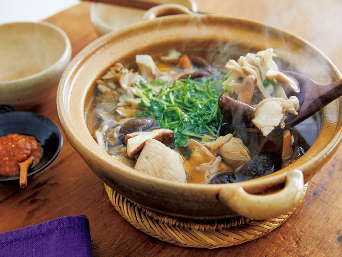 中/藤井恵さんの〈魔法の鶏むね〉中華風鍋。塩と砂糖をまぶしてしっとり感をキープした「魔法の鶏むね」を使って作る、中華風鍋。鶏むね肉ときのこのだしが煮汁にしみ出て絶品! 豆苗がよいアクセントに。