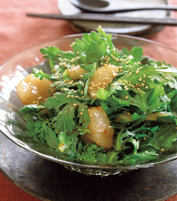 右/飛田和緒さんのふわふわ春菊メニュー。柔らかい葉先の部分を摘んで、帆立ての刺身とともに生のままサラダに。少し辛みをきかせたドレッシングが好相性。