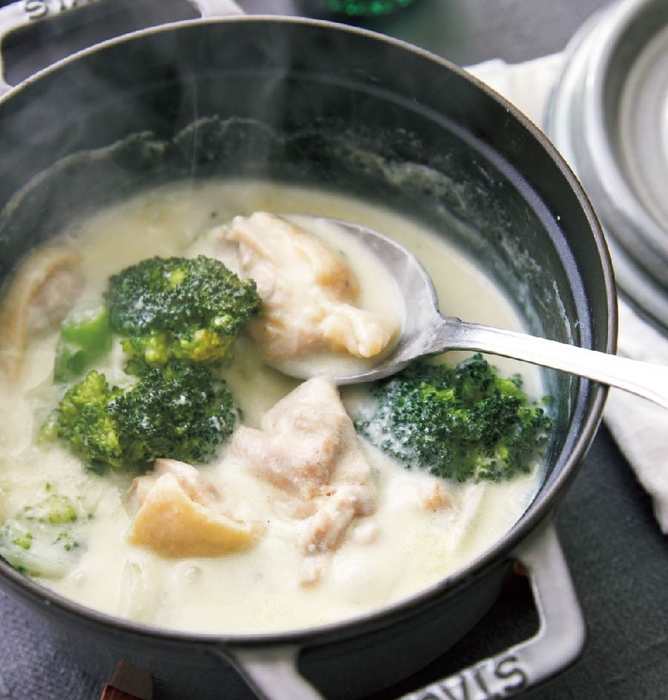 左/〈ブロッコリー×鶏肉で「食べる筋トレ」〉より、ブロッコリーと鶏のミルク煮。ブロッコリーのビタミンCやビタミンB6と、鶏肉の良質なたんぱく質。いっしょにとることで、骨や筋肉の基盤づくりに役立ちます。