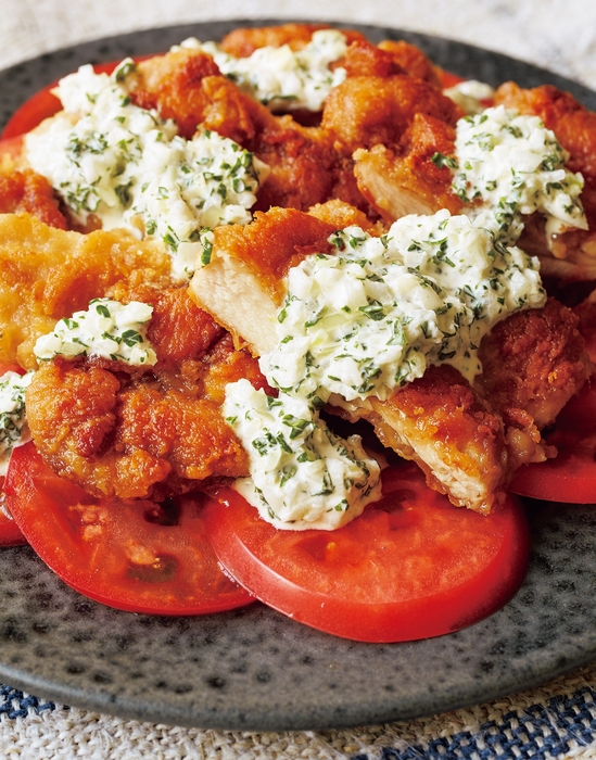 右/小田真規子さんの〈太らない鶏もも〉チキン南蛮風。鶏肉は少なめの油で揚げ焼きに。タルタルはマヨ+ヨーグルトで軽やかに。カロリーダウンしながら肉好きを満足させること間違いなし!