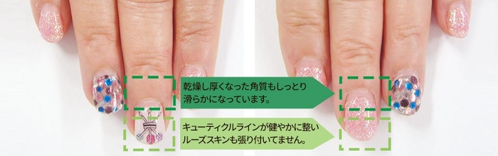 ・爪の根元部分、側面に塗布し、軽くマッサージするように馴染ませてください。