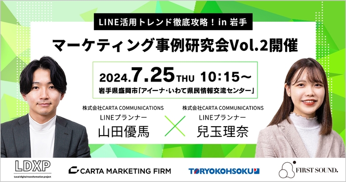 株式会社CARTA HOLDINGSのグループ会社で、マーケティング特化の事業を展開する株式会社CARTA MARKETING FIRM(東京都港区虎ノ門、代表取締役:西園 正志、以下CARTA MARKETING FIRM)は、株式会社ファーストサウンド(東京都中央区銀座、取締役代表:檜山 初音)、杜陵高速印刷株式会社(岩手県盛岡市、代表取締役:西野 正寿)と共同で推進するLDXプロジェクト*の一環として、LINE活用術を学べるプレミアムイベント「マーケティング事例研究会Vol.2~LINE活用トレンド徹底攻略 in 岩手〜」を、「アイーナ・いわて県民情報交流センター」にて開催しました。