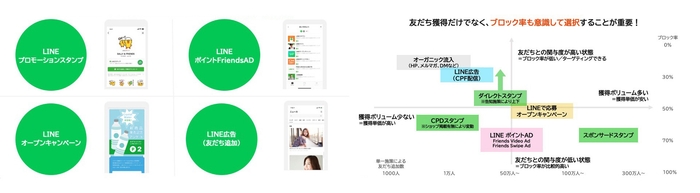 さらに、新たなユーザーとの接点を作るための友だち獲得の広告施策についても紹介。LINE広告施策には「LINEプロモーションスタンプ」「LINEポイントFriendsAD」「LINEオープンキャンペーン」「LINE広告(友だち追加)」の4種類があり、それぞれ目的や条件に応じて適切な施策を選ぶことが大切だと伝えました。