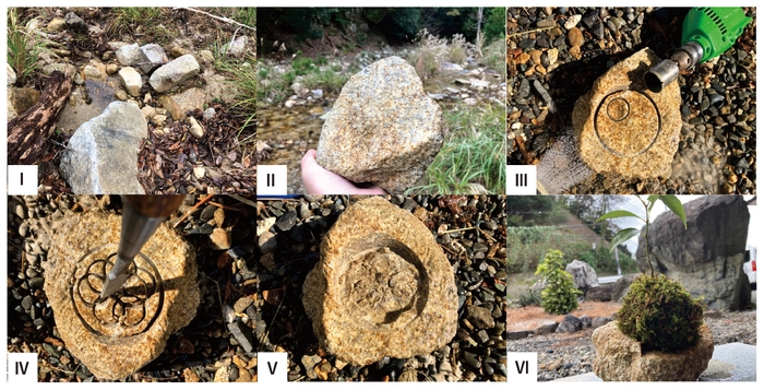 十分な大きさで、底部の座りのいい石材が見つかったら、あとはシンプルな工程で凹みを整形します(写真1:Ⅲ-V)。試作なので加工には現代の便利な道具を使用しました。