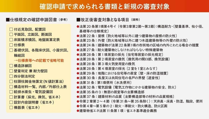 [上図・左]は仕様基準で通す場合の確認申請図書(参考)。[上図・右]のように審査項目が増えるため書類も増える。仕様基準で通す場合、伏図・軸組図は仕様書等に記入することで省略可能だ。ただ伏図自体は必要なうえ、建築士法で保管も義務化されており、誰がどう作成するかも決めておく。