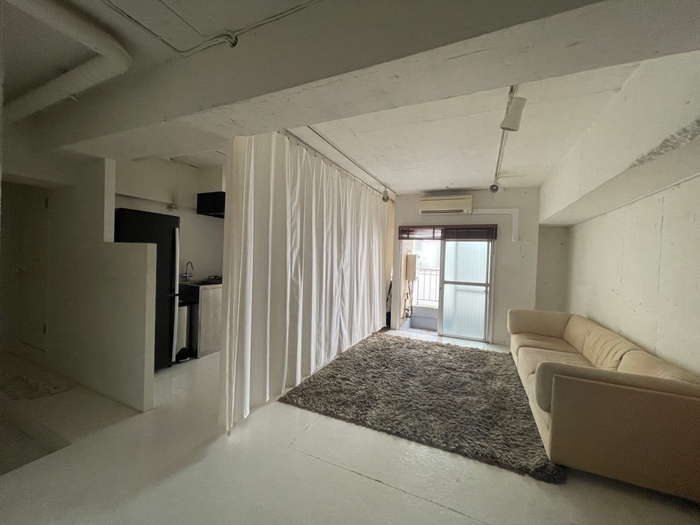 一階テナントは100円ショップとコンビニが入居中です。マンションの多くは住居としても使用されています。こちらのお部屋は家具家電付きです。お部屋は白基調としており明るく、ヴィンテージ感が溢れています。やや広めの玄関には自転車やキックボードなんかが置けそうです。ワンルームだがカーテンで間仕切ることもできます。