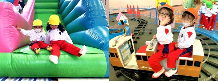 移動遊園地は、近畿大学九州短期大学の体育館に、ふわふわトランポリンやふわふわアスレチック(エアー遊具)、8の字のレール上を走る機関車トーマスの乗り物、子どもが簡単な操作で前進させられるバッテリーカーなどを設置する1日限定の遊園地です。未就園児から年長組まで、各年齢の子どもたちが安心・安全に思い切り遊べるように、学年ごとに利用時間を分けて実施します。また、年長組を対象としたかけっこ教室は、子ども向けの運動教室の先生にお越しいただいて開催します。走るときの身体の使い方や走り方のポイントはもちろん、走ることが苦手な子どもたちにも走る楽しさを感じてもらえるような内容となっています。