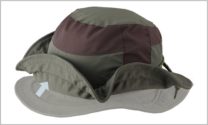 帽子は日よけの役割を果たす広めのツバで、日差し対策ができます。またフチに仕込んだワイヤーで型のニュアンスを好みに応じて造れ、日差しの気になるシーズンも安心して着用いただけます。さらにドローコードを絞ることで跳ね上げるツバの構造により、走行時のばたつきを抑え、視認性を確保します。(特許出願中)