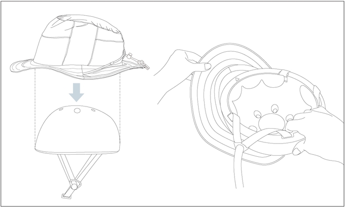 国内の頭部形状データに基づく設計で、快適な被り心地の軽量コンパクトなソフトシェル帽体に、パターンにこだわり立体感のあるアウトドアテイストの帽子(ヘルメットカバー)を装着。アクセントとして、アウトドアテイストのドローコードをプラスし、アクティブさを演出しています。