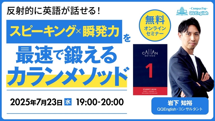 株式会社QQEnglish(本社:東京都渋谷区、代表取締役:藤岡頼光、以下QQEnglish)は、2025年7月23日(水)19時からQQEnglishの英語コーチング「Boost Coaching」コンサルタント岩下 知裕氏による「反射的に英語が話せる!スピーキング×瞬発力を最速で鍛えるカランメソッド」と題した無料オンラインセミナーを実施することをお知らせいたします。