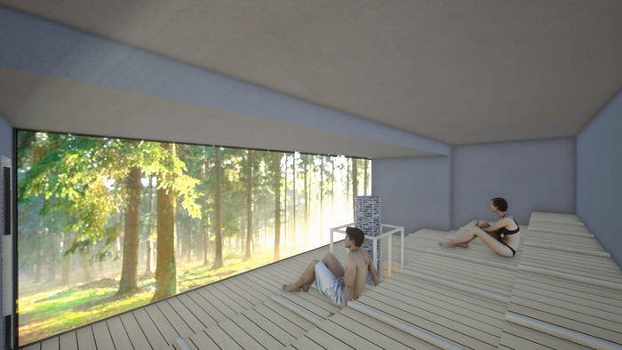 <共用サウナ:大人数が入浴可能なエンタメサウナでは、大型モニターから大迫力の映像が流れます。>