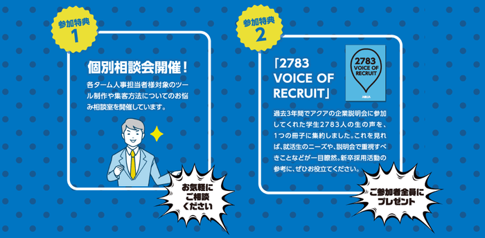 という結果も出ています。そんなアクアが考える圧倒的に学生集客を増やし、より学生に響きファンになってもらうための方法をお伝えするミニセミナーを採用映像・採用パンフレット・合同説明会装飾の3つのテーマで同時開催します。