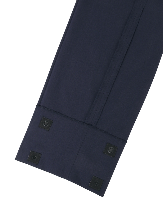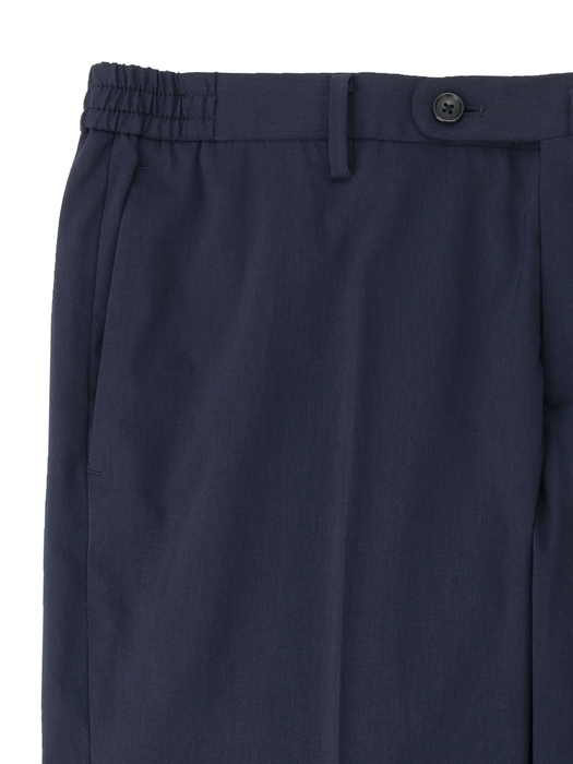 スラックスは、裾直しをせずにそのまま履けるジャスト丈と、裾裏のスナップボタンを内側に折り返すことで5㎝短いショート丈に調整ができる仕様となっています。ショート丈では、スニーカーを合わせたカジュアルスタイルとも相性が良く、コーディネートによって裾の長さを変えるなど幅広い着こなしに対応できるようにしています。またウエスト部分には、サイドゴムを採用することで、座った際の窮屈感も軽減します。