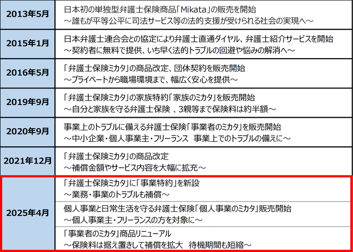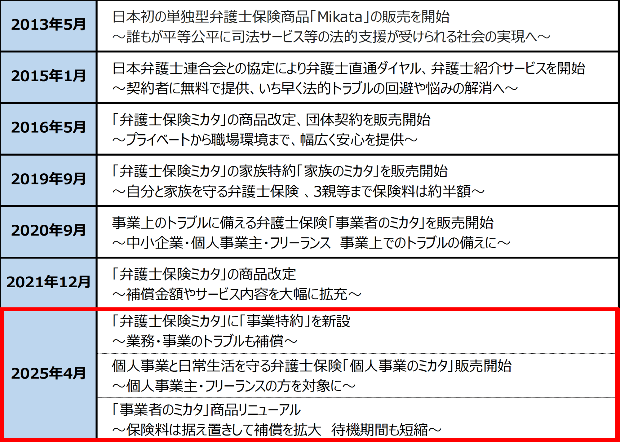 弁護士保険ミカタに、副業などの事業上で発生した法的トラブルにも対応できる「事業特約」を新設、働き方の多様化に伴い個人事業主・フリーランスの方を対象にした弁護士保険「個人事業のミカタ」を新発売、中小企業向けの弁護士保険「事業者のミカタ」のリニューアル等、補償範囲を拡大しました。