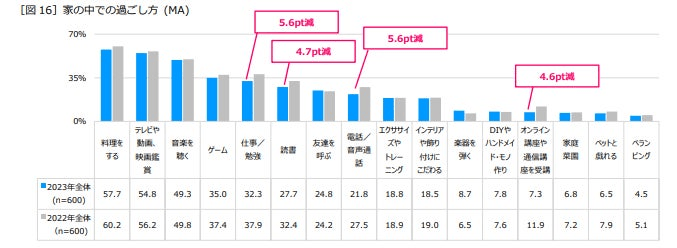 家の中での過ごし方について聞いたところ、全ての項目で割合が微減し、コロナ禍からの脱却を感じさせる結果となりました。1位の「料理」(57.7%)は昨年度から2.6ポイント減少したものの、依然として約6割と高い割合で、多くの人が自炊をしていることが分かりました。特に減少率が大きかったのは5位「仕事/勉強」(32.3%)と8位「電話/音声通話」(21.8%)がともに5.6ポイント、6位「読書」(27.7%)が4.7ポイント、13位「オンライン講座や通信講座を受講」(7.3%)が4.6ポイントそれぞれ減少しており、家での仕事や勉強の機会が減っている様子がうかがえます。外出機会が増え、通勤・通学が復活し、徐々に自宅での過ごし方に変化が起きているといえそうです[図16]。
