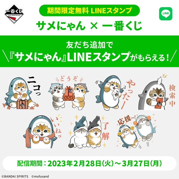 一番くじLINE公式アカウントを「友だち追加」すれば、2023年2月28日(火)~2023年3月27日(月)の期間限定で、『サメにゃん × 一番くじ』LINEスタンプを無料でダウンロードいただけます。