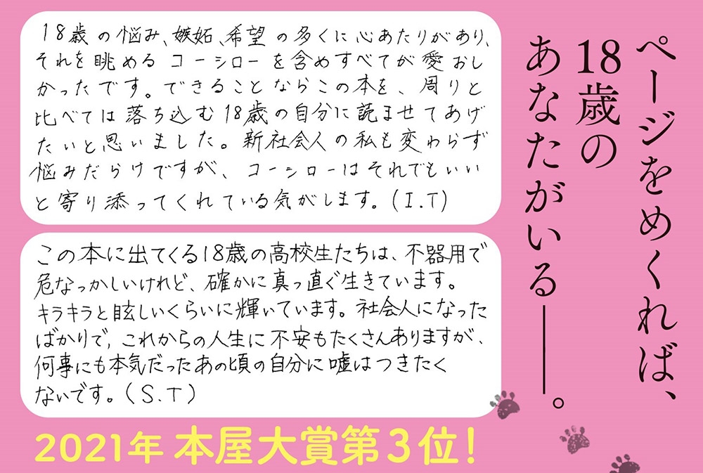 18歳の悩み、嫉妬、希望の多くに心あたりがあり、それを眺めるコーシローを含めすべてが愛おしかったです。できることならこの本を、周りと比べては落ち込む18歳の自分に読ませてあげたいと思いました。新社会人の私も変わらず悩みだらけですが、コーシローはそれでもいいと寄り添ってくれている気がします。(I.T)