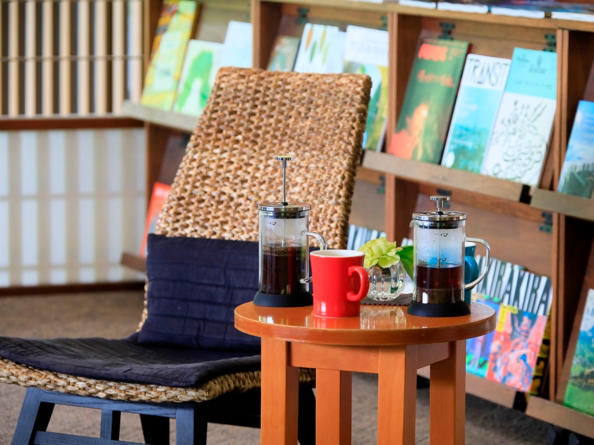 暖炉の前で豊かな自然を眺めながら、種類豊富なドリンクとともにお寛ぎいただけます。
