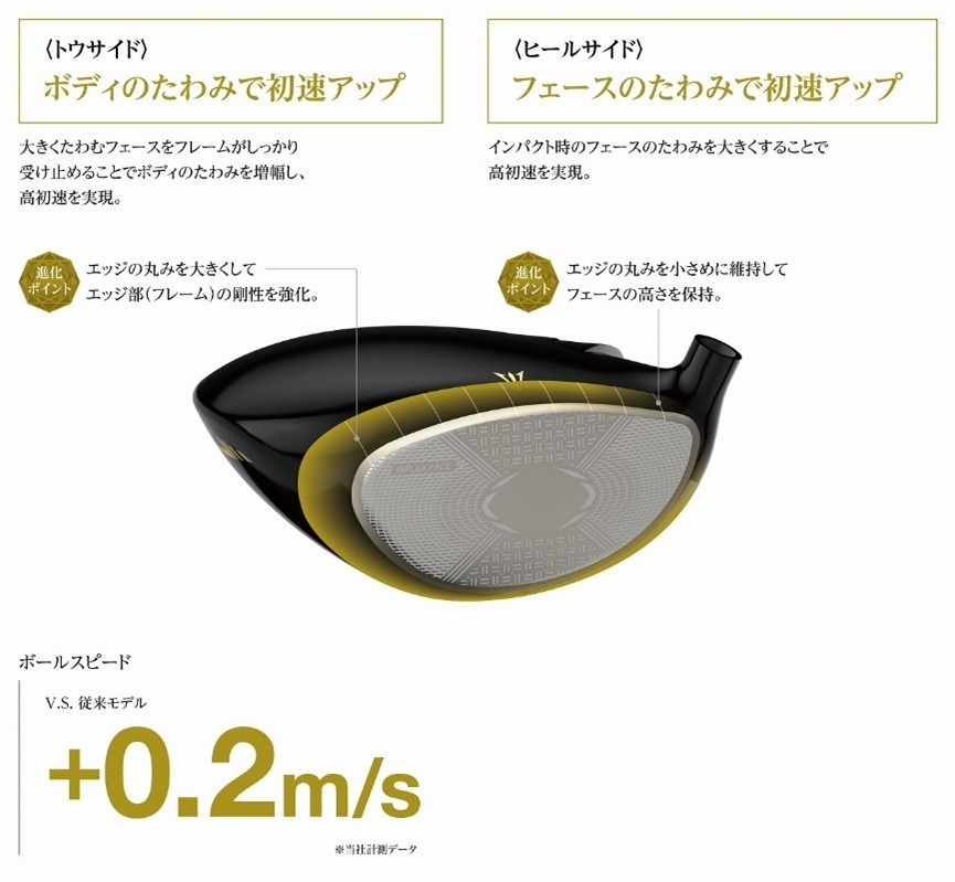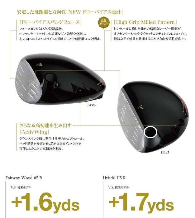 高初速エリアを拡大する「BiFLEX FACE」と、さらなる低重心化を可能にする「CANNON SOLE」(キャノンソール)が高く大きな飛びを実現。また、「ActivWing」と「New ドローバイアス設計」がつかまりを良くし、安定した飛距離を実現します。