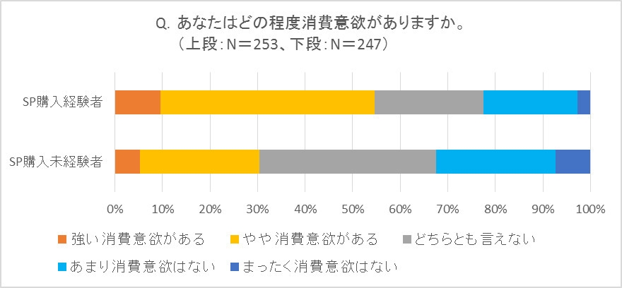 (2)ソーシャルプロダクツの購入経験者は、購入未経験者と比べて消費に対する意欲が高い