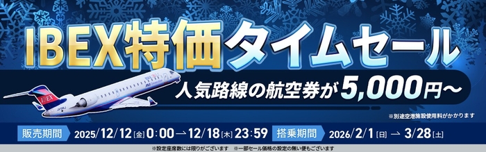 アイベックスエアラインズ株式会社(本社:東京都江東区、以下 IBEX)は、2026年2月1日~3月28日ご搭乗分を対象とした「IBEX特価タイムセール」を実施します。