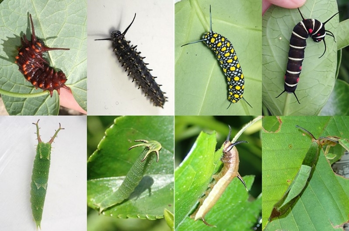 研究グループは、先行研究において、アオジャコウアゲハの幼虫(図3上段一番左)の柔らかい角の役割を検証しました。その結果、柔らかい角はすべての幼虫がもつ短小な触角を補助し、食草の発見効率を上げる役割を果たしていることを突き止めました(Kandori I. et al. 2015. PLoS ONE)。これについて普遍性を検討するため、現在、同じく頭部に柔らかい角をもつアサギマダラの幼虫(図3上段左から3番目)を用いて検証実験を進めており、仮説通りの結果が出てきています。