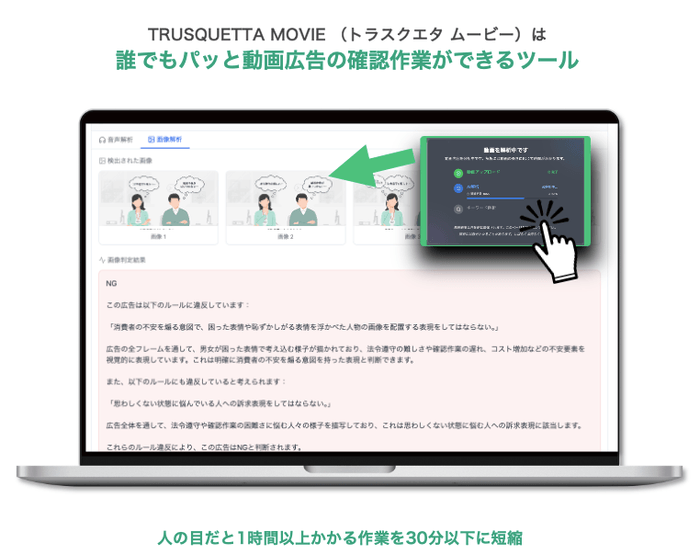 ついに【トラスクエタ ムービー】 動画広告の表現チェックが可能に。 セリフとテキストの自動検出、AIが文脈判定と解析を実現。