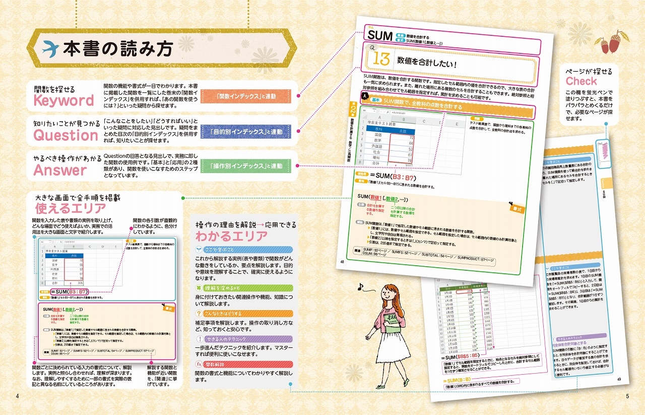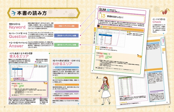 本書は、各関数の基本的な働きと構文の書き方を紹介するパートのほか、左半分が操作手順を実際の画面写真をもとに紹介する「使えるエリア」、右半分が操作の理由をわかりやすく解説する「わかるエリア」といった2パートに分かれた構成を採っています。とりあえず手順だけ知りたい! という急ぎの場面でも、じっくりと理由まで理解したいという学びの場面でも、状況に合わせて活用していただけます。