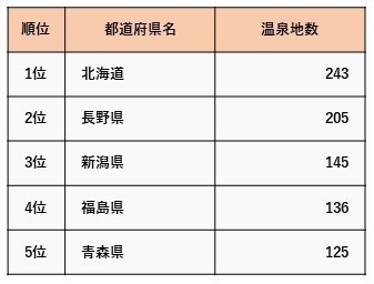 2位は長野県で、蓼科温泉、渋温泉、別所温泉などがあります。そして3位新潟県、4位福島県、5位青森県と、本州北部の都道府県が続きます。