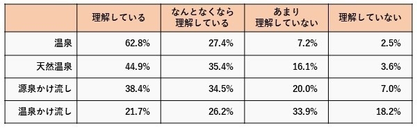 「温泉かけ流し」に関しては、理解していない割合の方がやや高くなっており、言葉自体聞いたことがないという方も多かったかもしれません。