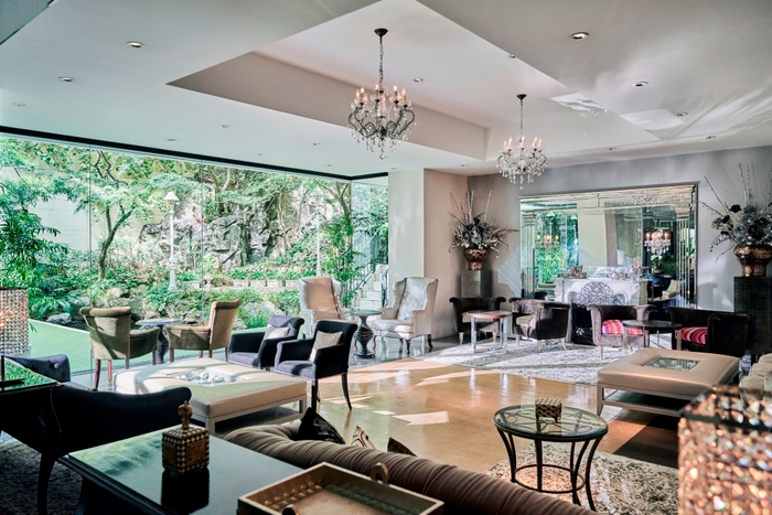 建物のどこにいても自然光が差し込むよう、サンクンガーデンを囲むように造られた一軒家。流れる滝のせせらぎと、年間を通して緑が美しいガーデンでは、ゲストと一緒にシャンパンやスイーツをお楽しみいただくことも可能です。