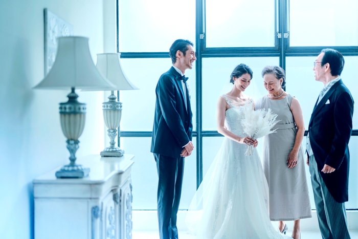 挙式前のファミリーミート。誰よりも早く、おふたりの晴れ姿をご家族にご覧いただける時間を設けています。