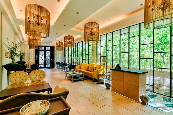 中央にあるミモザカラーのシンボルソファをはじめ、ヨーロッパより直輸入した個性的なソファを配置した洗練された空間はフォトスポットとしてもおすすめです。