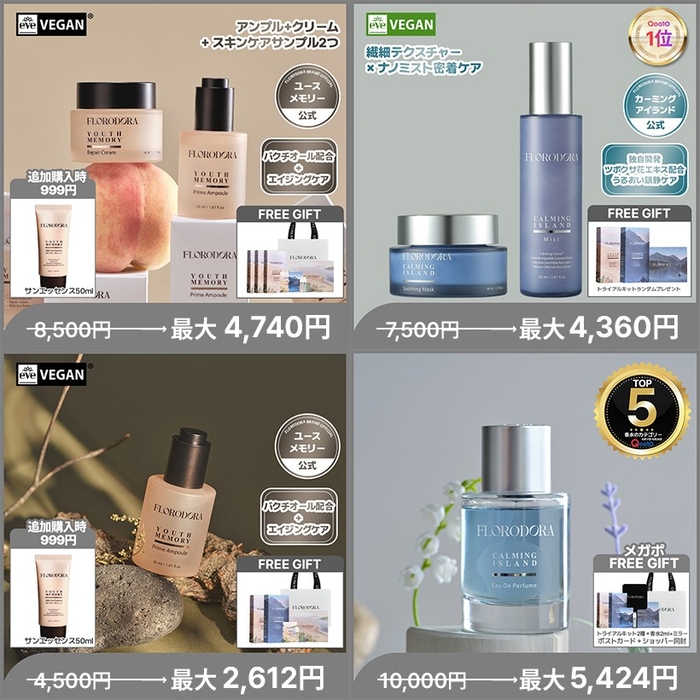また、期間中にカーミングアイランドセットまたはユースメモリーセットをご購入の方には、通常価格2,000円台の「フローロドラ サンクリーム」を999円で追加購入できる特典もご用意。ブランドファンからも「最もお得な構成」と評される限定企画です。