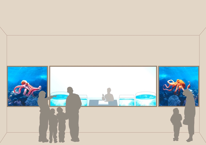 国内で初めて深海魚コンペイトウの繁殖やアオウミガメの人工繁殖に成功し、ウミガメやゲンゴロウなど希少生物の保護活動を行っている越前松島水族館では、ミズダコのふ化・飼育にも30年以上取り組んできました。これまでもミズダコやミズダコの赤ちゃん(稚ダコ)の展示を行ってきましたが、ミズダコに特化した展示施設は、今回オープンする「みずだこ館」が国内の水族館では初の施設となります。
