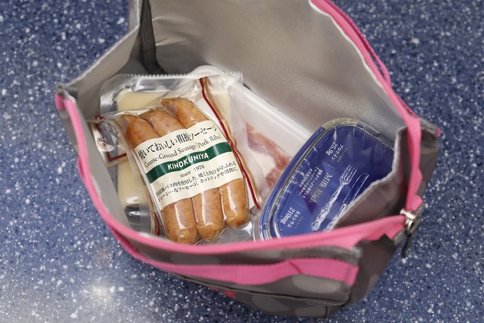 【使用例】 保冷剤とともに、100g程度の精肉パック、ヨーグルト、ソーセージなどを入れて。常温で持ち帰るのが心配な買い物のときにも重宝します。