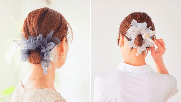 シンプルな装いにスパイスを与える咲き編みシュシュ「ソルト」&「ペッパー」も同時リリースしています。