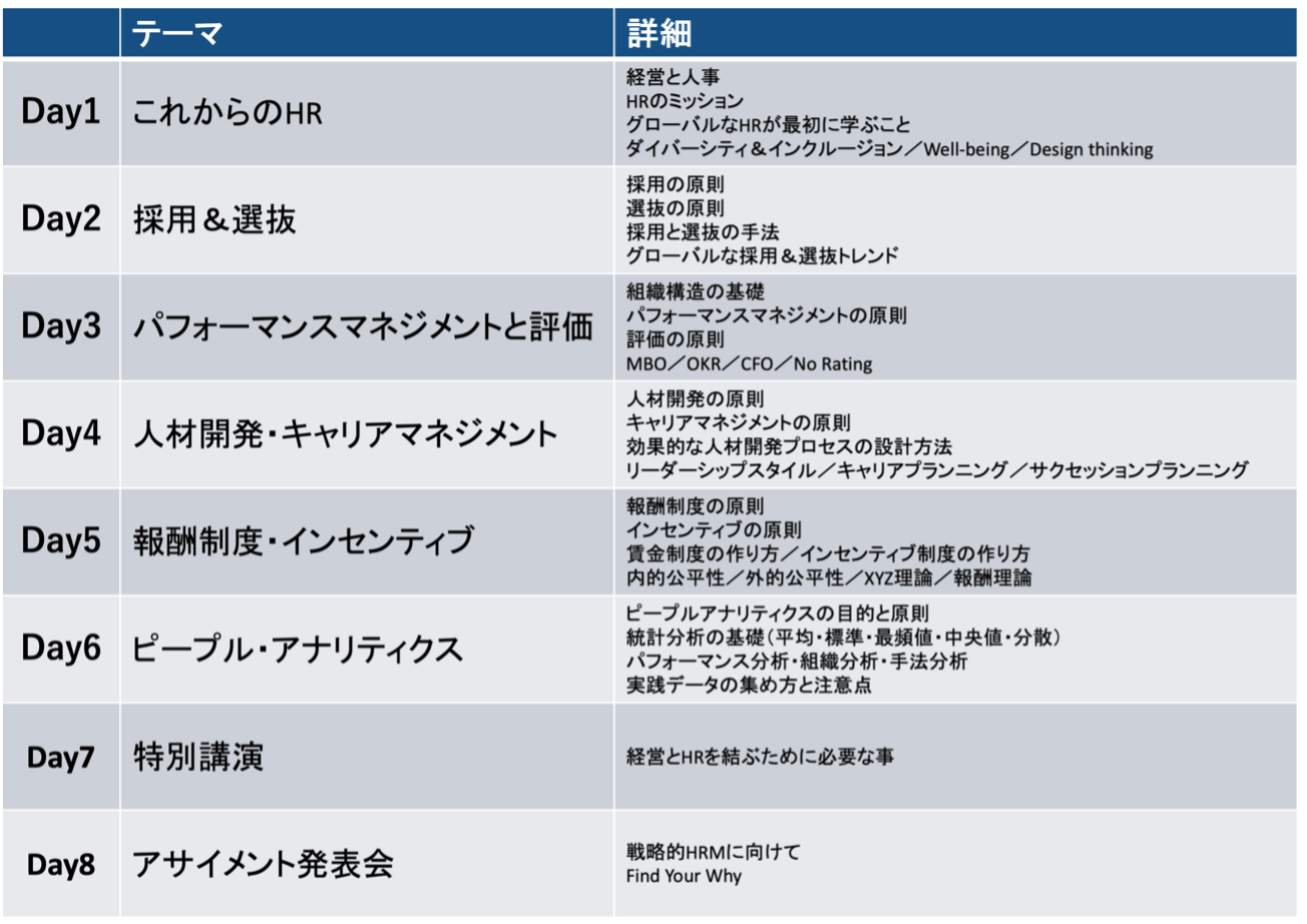 HRBP養成講座は、Day1からDay8までの8講座構成となっており、まず全体像を掴み、HRの各領域をテーマとした講義で理解を深め、特別講演で実践のヒントを得る構成となっています。