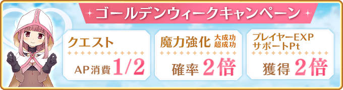 クエストAP1/2、プレイヤーEXP&サポートPt2倍、魔力強化大成功&超成功率2倍