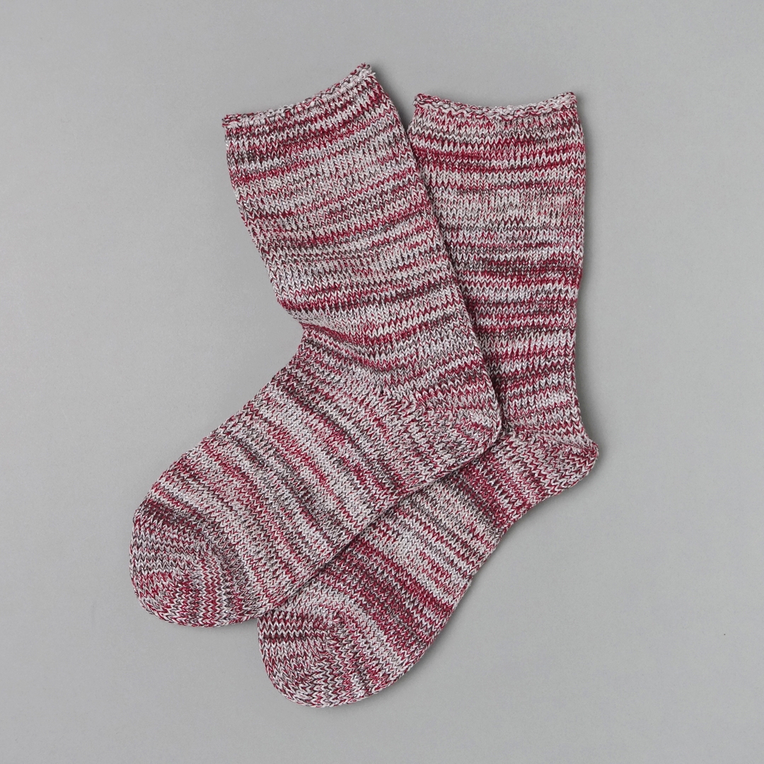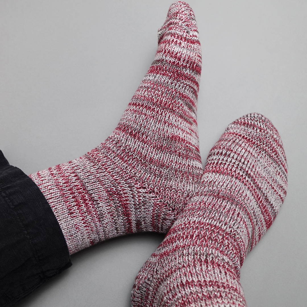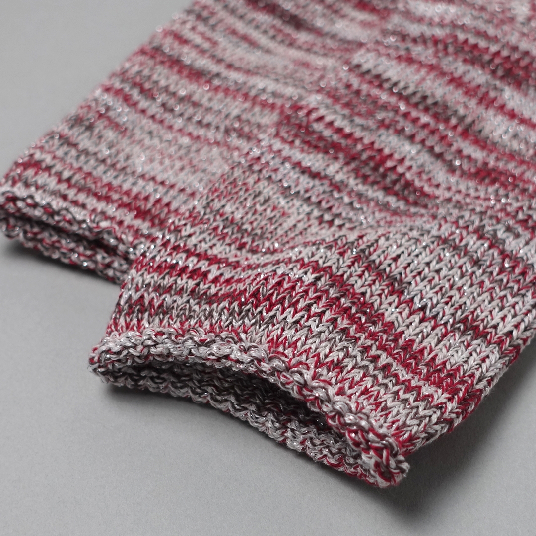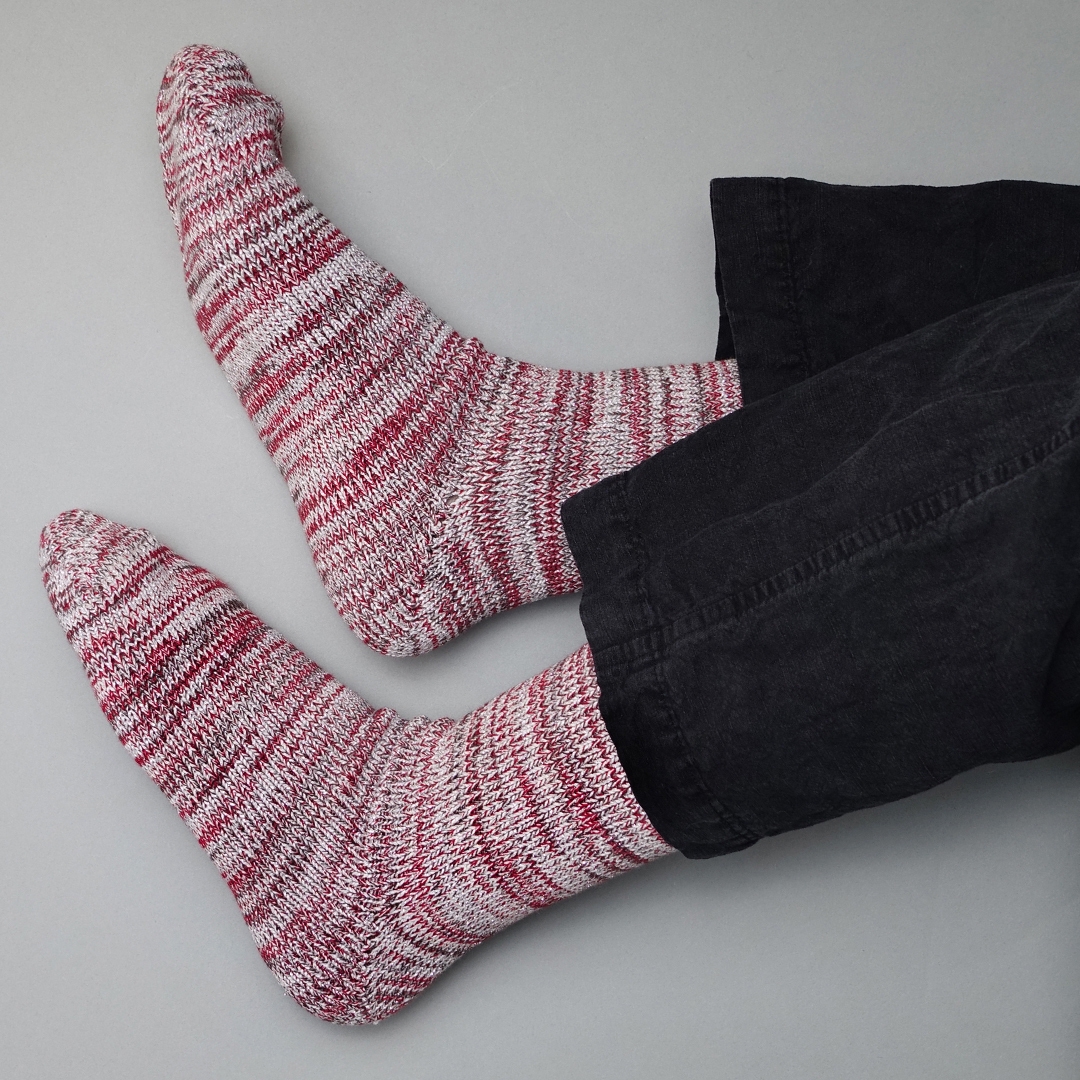 自転車を漕ぐ力で靴下を編む「チャリックス」( https://www.charicks-online.jp/ )にも使われている、希少なヴィンテージの靴下編機を使用し、「平螺鈿背八角鏡」から着想を得た数色の糸を束ねて編みあげています。同じ色の糸を使いながらも、一足一足同じ柄に編みあがらないことから「思うようにいかない様」を表現しています。一つずつ違う色合いの妙を、ぜひお楽しみください。