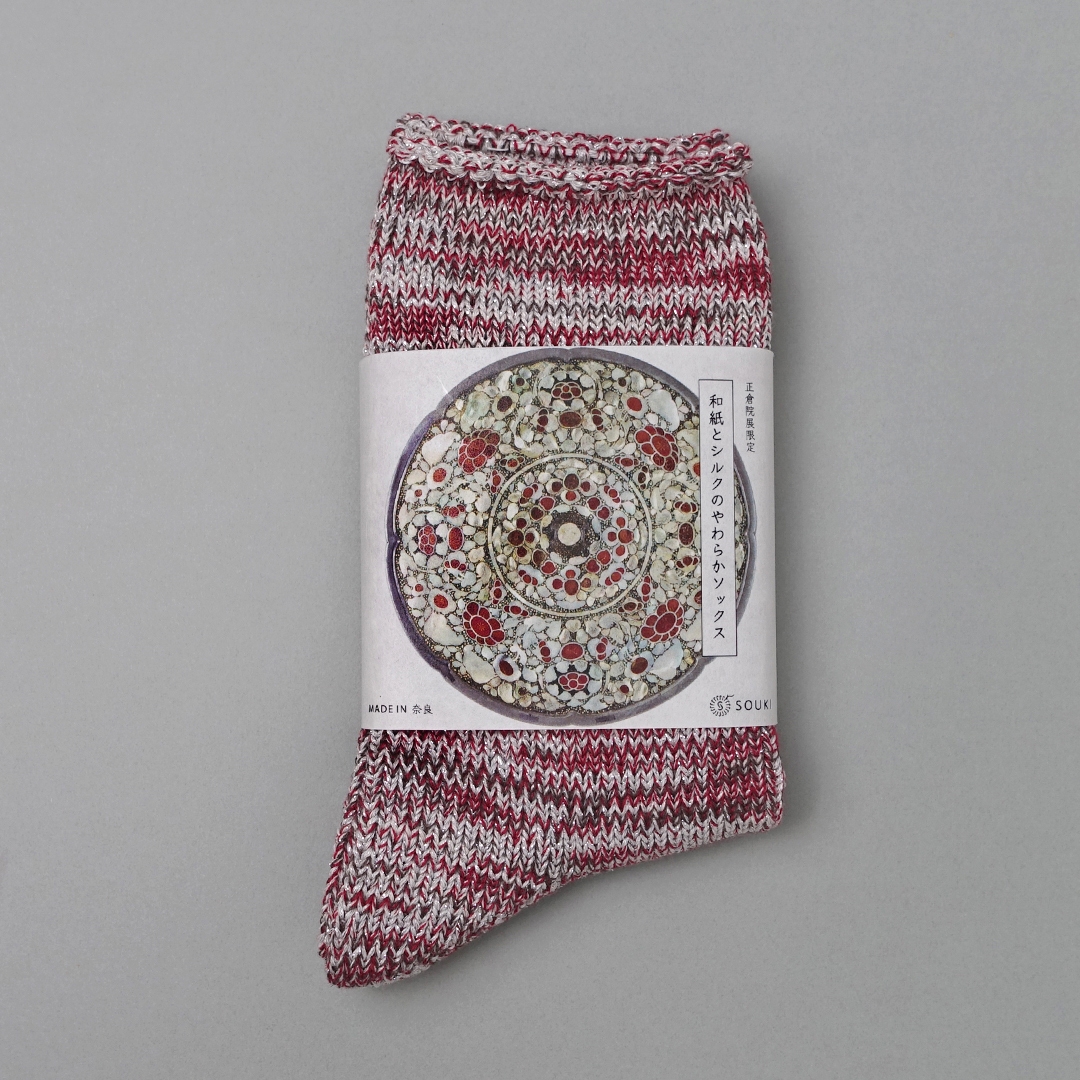 正倉院北倉に納められている「平螺鈿背八角鏡(八角鏡 平螺鈿花鳥背 第7号)」は、ヤコウガイの螺鈿(らでん)で描かれた花々に、琥珀(こはく)の赤が映える、美しい鏡です。唐で創られた、聖武天皇ゆかりの品とされ、『国家珍宝帳(こっかちんぽうちょう)』にも記録されています。角度によって色合いを変えるヤコウガイの表面には、繊細なラインが彫り込まれ、咲き誇る花々が表情豊かに感じられます。花弁や花芯に配された赤色は、琥珀の下に彩色がほどこされているため、複雑な色あいでありながら鮮やかな輝きを放つのです。そんな平螺鈿背八角鏡のもつ荘厳な美しさを、「SOUKI ORIGINAL-和紙とシルクのやわらかソックス-」で表現するため、使用する糸はテストを重ねながら厳選しました。深みのあるスカーレットとブラウン、そこに螺鈿をイメージさせるラメ糸を品良くミックス。色の出方は一足一足異なるので、選ぶ際に、また着用の際に、配色の妙をお楽しみいただけます。