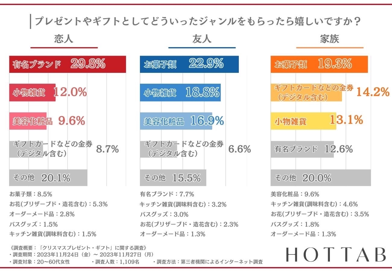 恋人に贈るプレゼントでは『有名ブランド(29.8%)』、友人・家族に贈るプレゼントでは『お菓子類(友人:22.9%、家族:19.3%)』がトップ