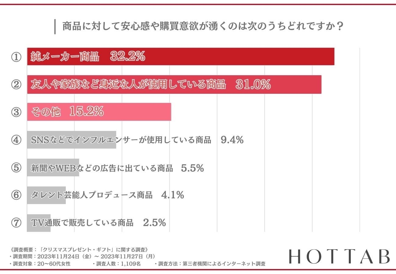 『純メーカー商品(32.2%)』『友人や家族など身近な人が使用している商品(31.0%)』『その他(15.2%)』『SNSなどでインフルエンサーが使用している商品(9.4%)』『新聞やWEBなどの広告に出ている商品(5.5%)』