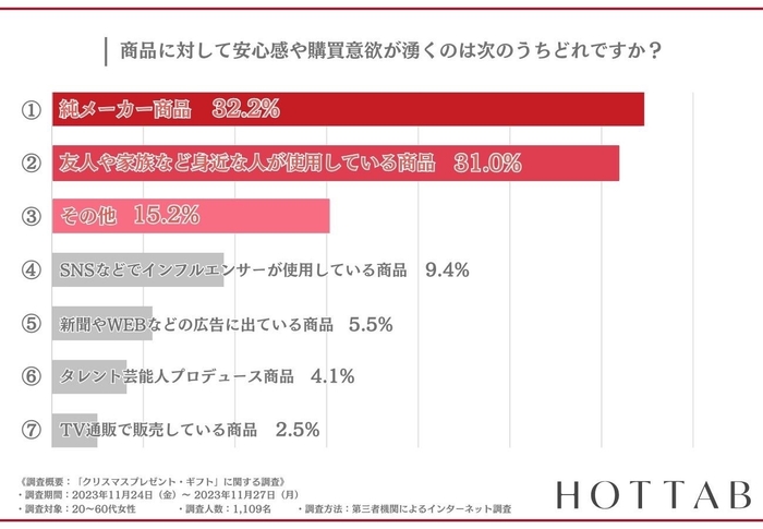 多くの美容家やトップアスリートに支持されている”純正重炭酸入浴剤”の開発・販売を手掛ける株式会社ホットタブ(本社:東京都新宿区、代表取締役:小星重治)は、20〜60代女性1,109名を対象に「クリスマスプレゼント・ギフト」に関する調査を11月24日実施しました。
