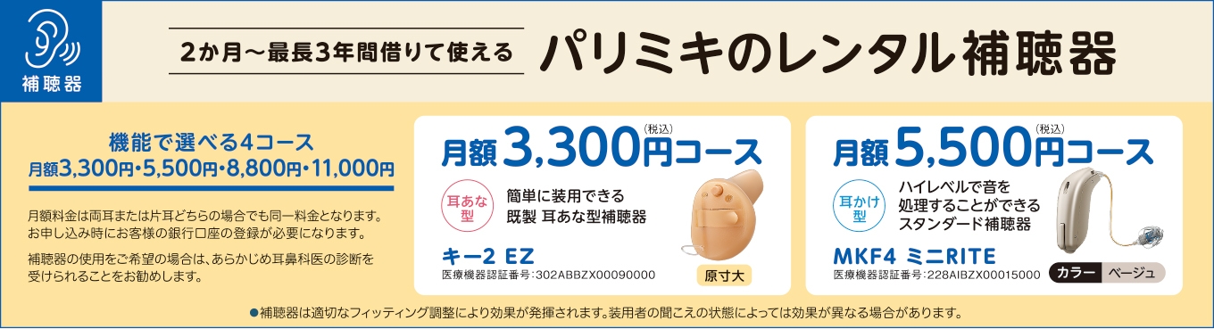 パリミキのレンタル補聴器なら、お手軽な月額3,300円(税込)コースから選べます。購入するのが不安な方は、まずはレンタルから始めてみませんか?